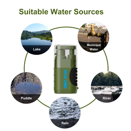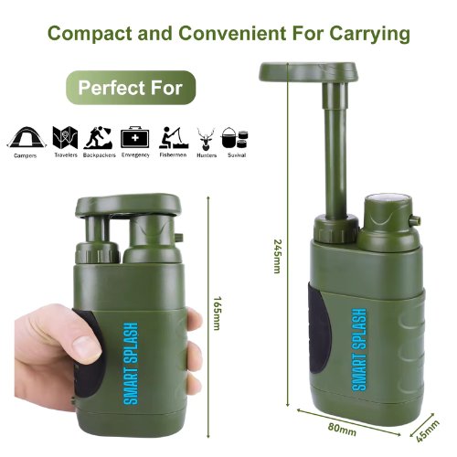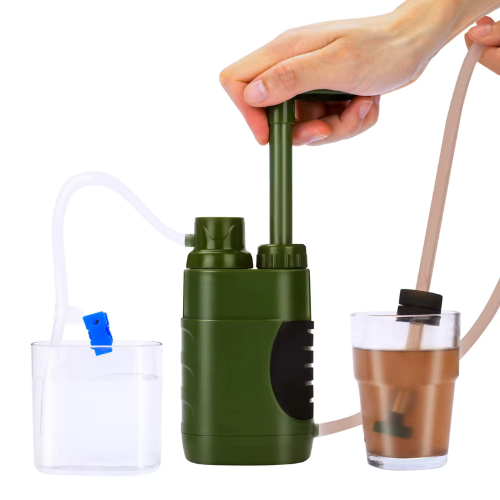 Stay hydrated and safe with our Portable Hand Pump Water Filter, perfect for emergency and survival camping. This compact, lightweight filter uses patented technology to remove 99.99% of bacteria, protozoa, and microplastics, ensuring pure water from any source. Easy to use, just attach the inlet hose, pump the handle, and enjoy clean water instantly.